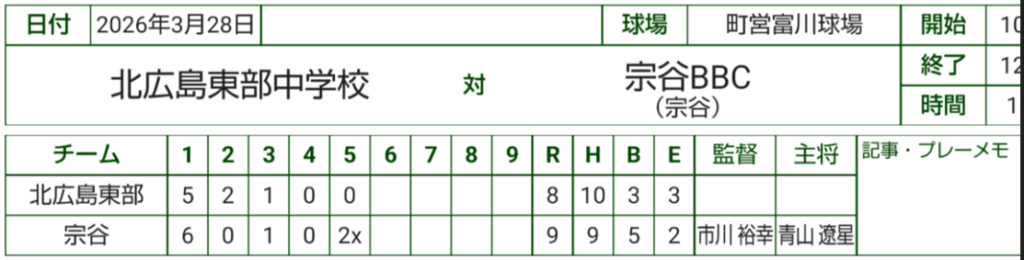 本日練習試合をしていただいた北広島東部中学校と日高西部富川ベースボールクラブの選手の皆さん、指導者の皆様、保護者皆様、この度は本当にお世話になりました。来年以降もこの3月に来させていただきたいと思っておりますので、今後ともどうぞよろしくお願いいたします。
